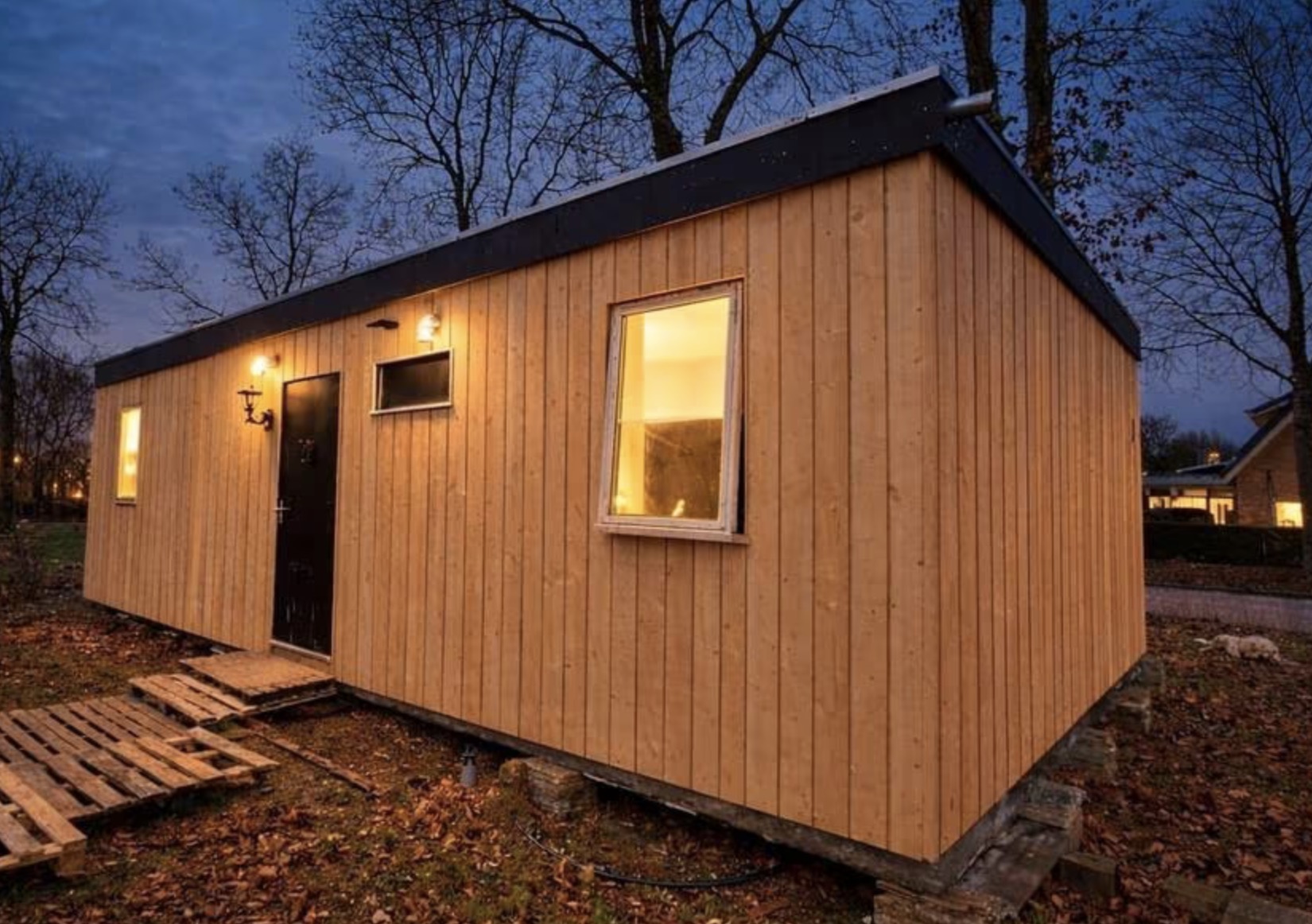 Obytná jednotka, která stála dva roky na zahradě. Skládá se z železné klecové konstrukce se sendvičovými panely. Obložena douglaskou a má volně stojící střechu pro lepší izolaci a úplnou hydroizolaci. Rozměry: Jednotka má 9,20 x 3,15 m Střecha má 9,70 x 3,65 m.